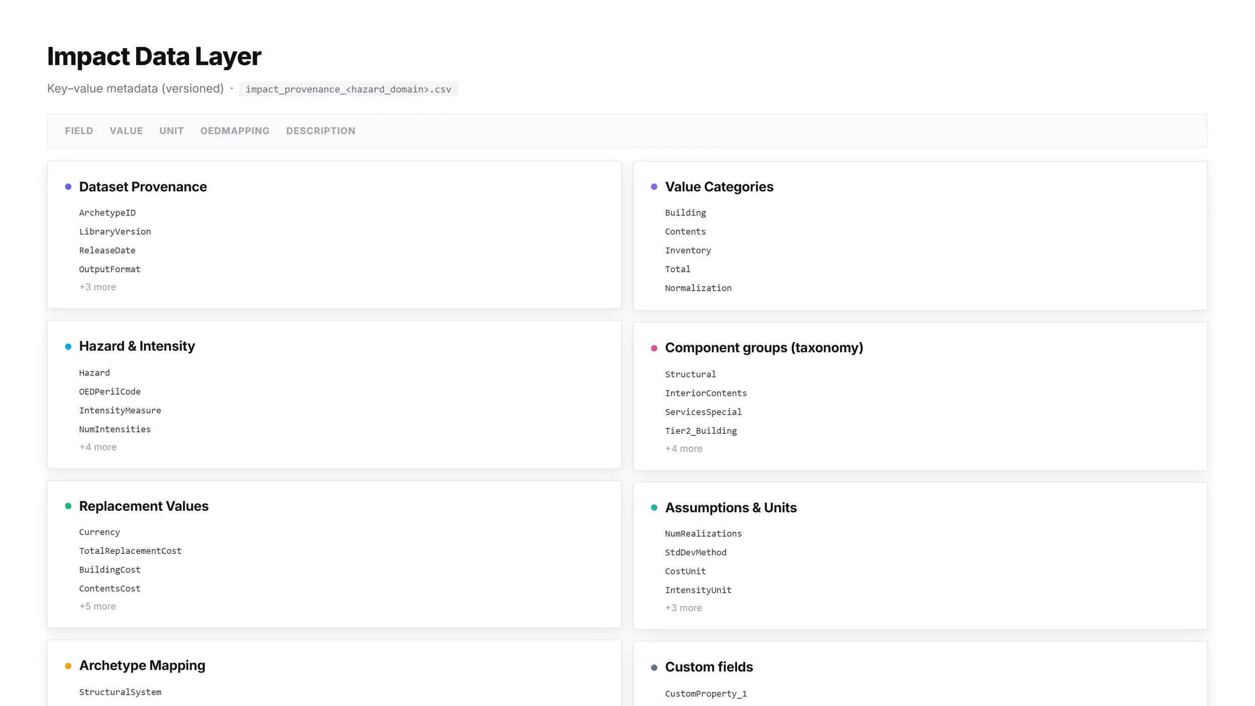 Coverage + metadata (taxonomy, units, assumptions, versioning)