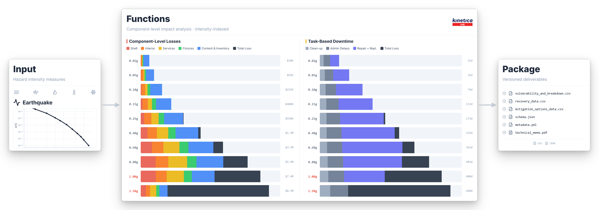A licensed, engineering-grade impact data layer that maps hazard intensity to component-level impacts and system consequences (loss + downtime), designed for consistent platform integration.